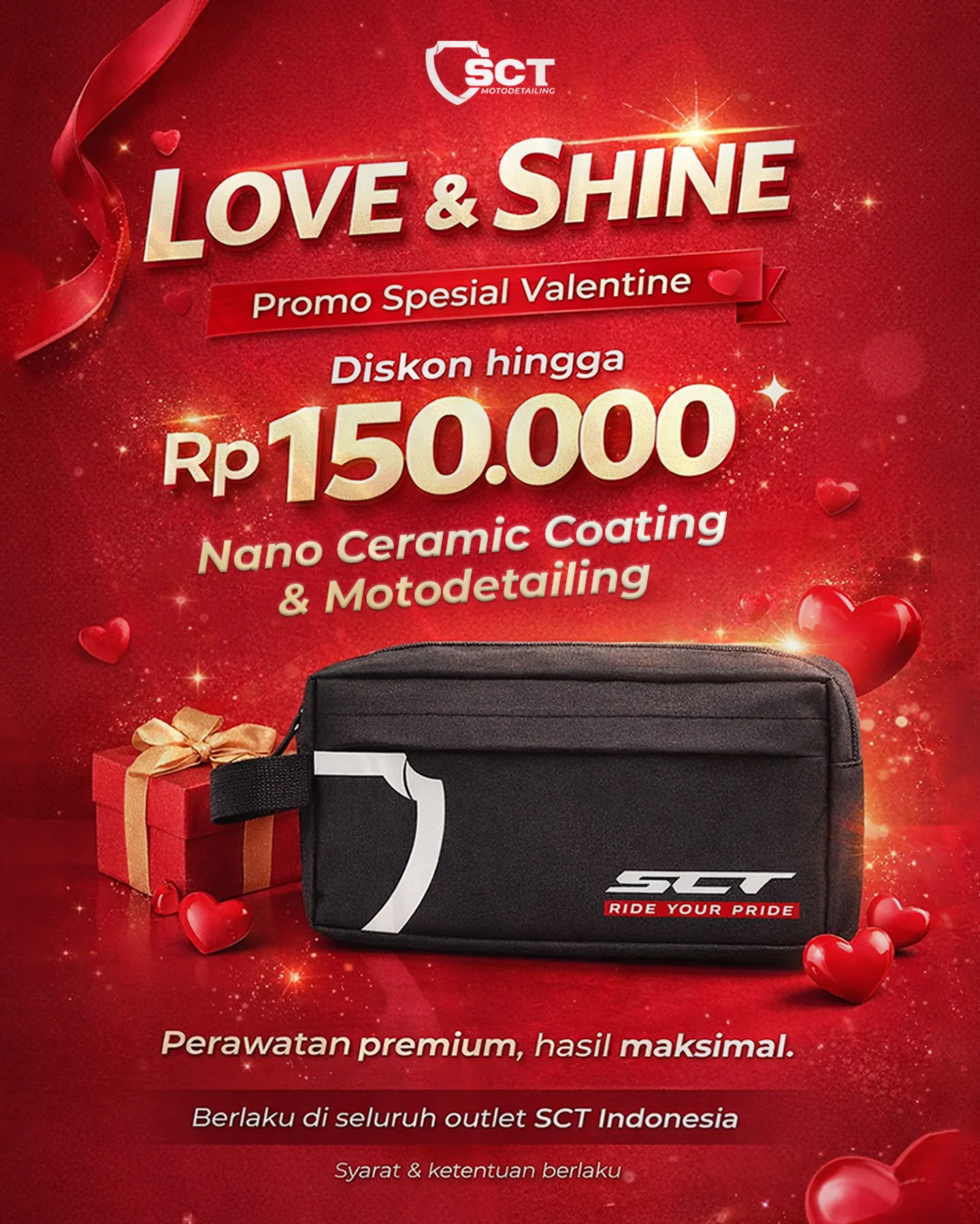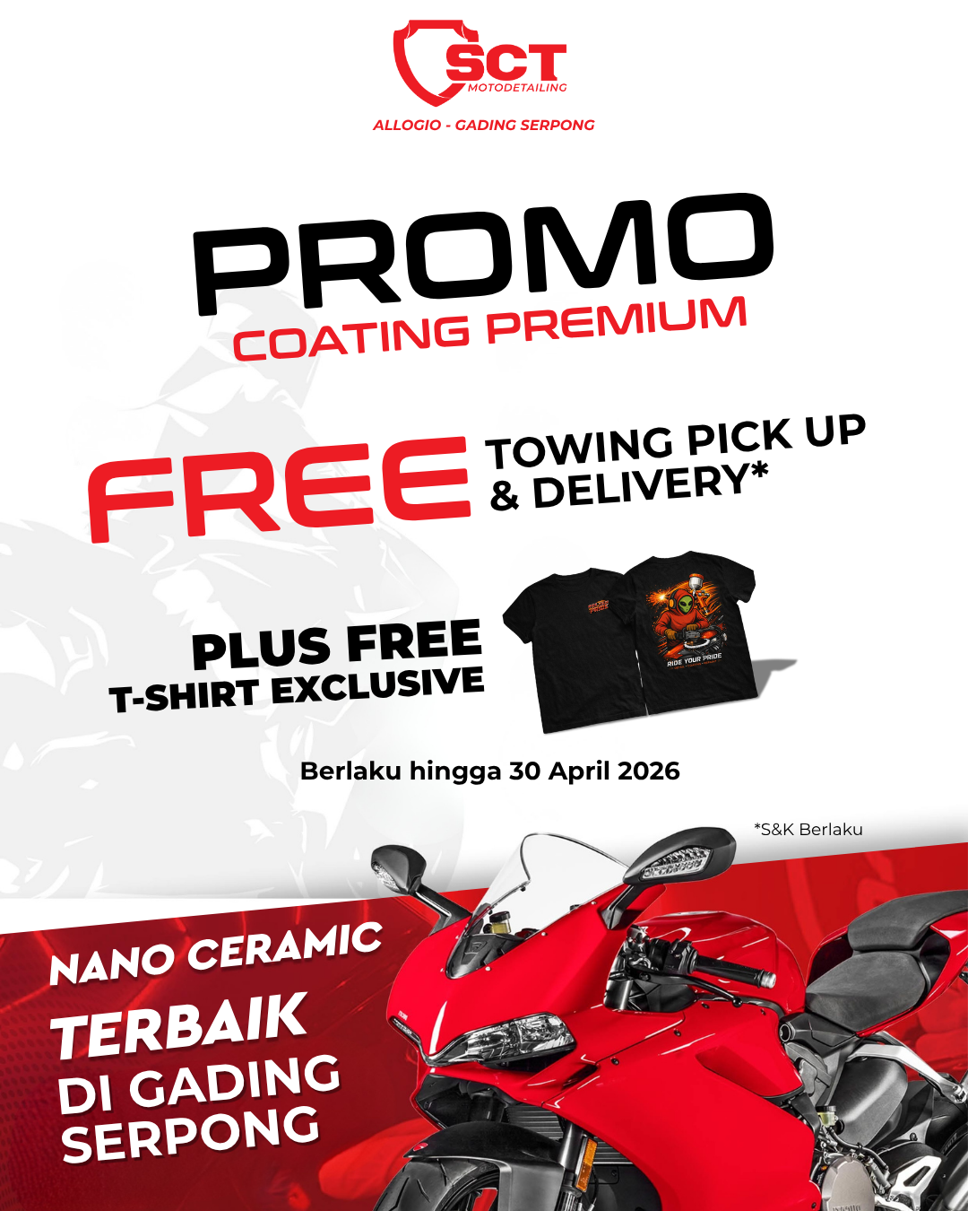 - Jadi value utama yang ditawarkan SCT Premium Coating adalah : menjaga dan meningkatkan kilau motor permanen dan mengurangi resiko kerusakan cat dari segala kontaminasi yang umum terjadi.